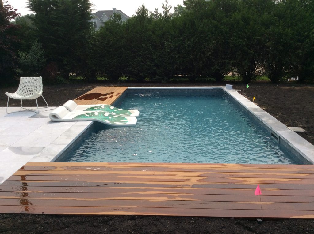 Installation of a 12’x24′ steel wall pool, with a mix of Marble & Ipe coping & decking….. softening the hardscape, We implemented gravel sitting areas with sod surround.